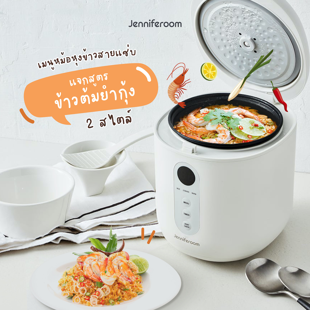 เมื่อเข้าสู่หน้าร้อนพวกเราชาวไทยก็คงไม่ค่อยอยากจะย่างกรายออกจากห้องไปซื้อของกินสักเท่าไหร่ ยิ่งถ้าต้องออกไปต่อคิวเข้าแถวหน้าร้านอาหารอีกก็ดูจะต้องเลือกระหว่างฮีทสโตรกกับมะเร็งผิวหนัง วันนี้น้องเจนนี่จึงขอนำเสนอเมนูสุดแซ่บอย่างข้าวต้มยำกุ้ง 2 สไตล์ที่ทำเองได้ง่าย ๆ ที่ห้องเพียงแค่มีหม้อหุงข้าวใบเล็ก ๆ สักใบอย่าง Jenniferoom Macaron Rice Cooker 0.8L ที่ทำได้ทั้งหุง อบ ต้ม ตุ๋น โดยไม่ต้องใช้อุปกรณ์อื่นใดให้ยุ่งยากตอนเก็บล้างอีกด้วย